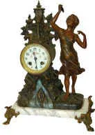 Running and striking properly. The 15.5 inches high metal case was painted (original) in body tones and landscape tones. The piece above the clock is...