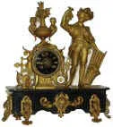 French statue-clock. A busy little clock with ornaments dangling all over the black onyx base, clock tower, and the grape picker.
