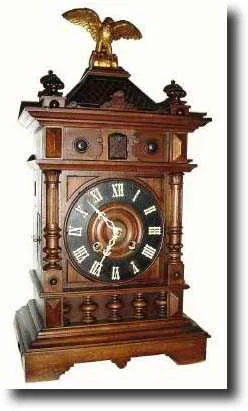 C.1920, An interesting fusee Shelf Cuckoo clock in an architectural case, surmounted by a gilt wood eagle, finely carved. The movement is a very large cast plate job with fusee on the strike side, recently serviced and with new bellows on the old flutes. In excellent working order. From a gentleman near Hartford. Height 23" $1200-1600