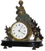 Lady sitting on the clock is holding flowers; clock and side ornaments sit on a wood base. A small part of a leaf is missing on the left side. There ...