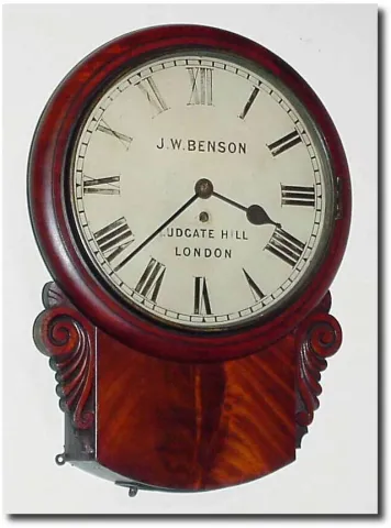C.1920, English, J.W. Benson, London, 11' fusee drop dial in a well made case with crotch mahogany veneers in good condition and with original carved "ears' intact.