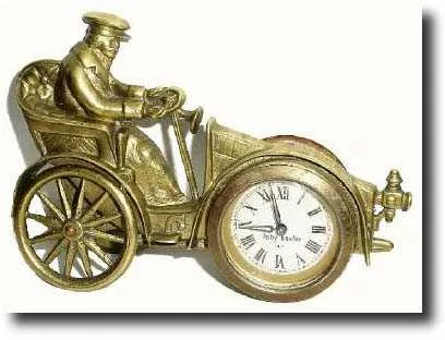 C.1920, English, Toby Baxter, 30 hour desk novelty clock in the form of a car and driver. The rear wheels turn on an axle, as well as make the clock "stand up" on the desk. Form novelties such as this have been very popular this year. Height 5" $150-250