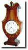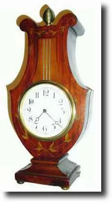 C.1920, French Mini Lyre shaped clock in good condition. There are some small nicks and scrapes in the finish of the clockÖ. someone handy with shellac can fix this up; the "strings are brass inlay and the leaves are satinwood. Retains a good porcelain dial and original hands and seems to be ticking fine. Height 11 inches $125-175