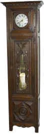 81 inch dark oak case with substantial carving on the front. An unusual feature are the heavy, round, brass hinges that extend full length of the doo...