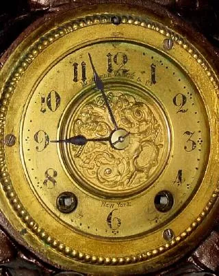 Condition: Cast spelter case with nice old bronze finish that looks to be original. There has been a repair to the palm tree. The original dial signed...