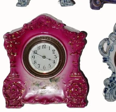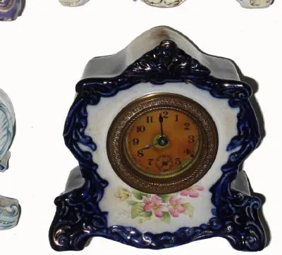1) German blue/white with broken tips and raised flowers, no hands, movement loose and dirty. 2) Ansonia, Royal Bonn, with German fit up movement. 3)...