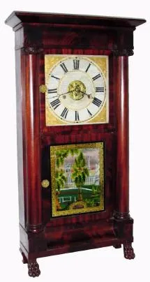 C.1840, Silas Burnham Terry, Plymouth, Conn, large brass works 8-day full column and cornice shelf clock with paw feet.
