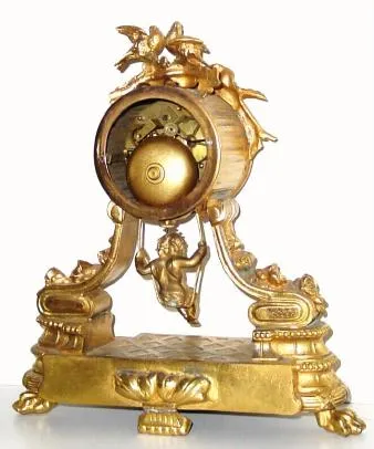 Condition: Silvered brass dial has some tarnish; areas of the case have lost their gilding. Bell is a replacement. Cherub pendulum is original. Seems ...