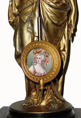 C.1880, French, "Mystery Clock", patinated gold over spelter statue, with portrait pendulum.