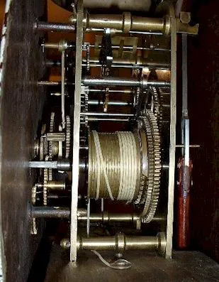 The movement has deadbeat escapement and maintaining power, and a wood rod pendulum with a cylindrical brass bob. The brass-cased weights have particu...
