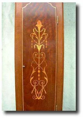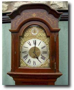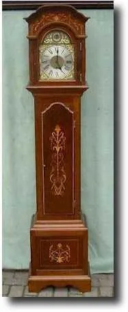 A small Edwardian longcase clock with a mahogany case inlaid with fruitwoods and boxwood.