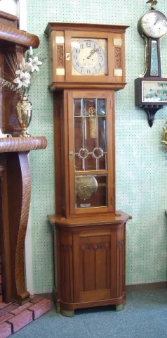 2 Piece Cabinet Floor Clock With An 8 Day Vienna Two Weight Movement, In A Walnut Veneered Case With Carvings And Brass Accents.
