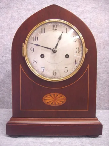 German Lancet Top Mantel Clock With Inlay And Satin Banding In A Mahogany Veneered Case, By Badische Urhenfabrik, Furtwangen, Germany. Circa 1910-1920.