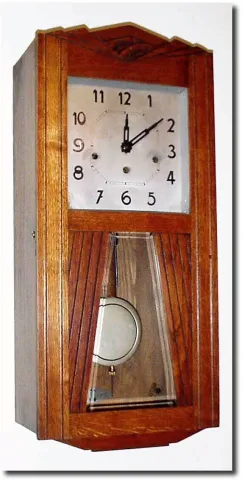 C.1925, French Oak Box clock, Westminster chime. Note this movement was originally in a clock with octagonal dial opening, and the repairman simply took the square dial and riveted it over the octagonal dial, and installed it onto this seat board. Looks and runs and chimes; could stand cleaning; beveled glass intact; height 25'