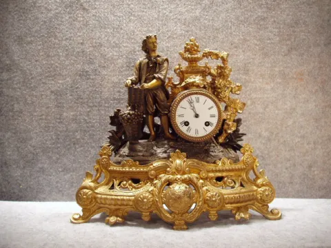 French Spelter Case Mantel Clock With A Man And Grapes Motif. Circa 1885.
