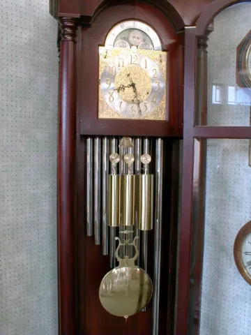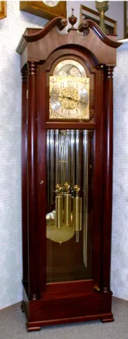 Full Plain Solid Mahogany Columns, A Swan Pediment Top With A Center Finial. The Arched Dial Has A Painted Moonphase, Gilt Corner And Dial Center Span...