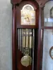 Massive Hall Clock By The Colonial Manufacturing Co., In An American Case Made Out Of Solid Mahogany With Plate Beveled Glass In The Lower Front Door, The Sides And Side Doors. Circa 1900-1915.