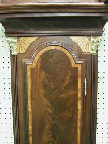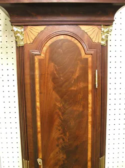 The Case Is Veneered With Flame Mahogany Veneers And Fan Inlays In The Sheraton Style. The Front Hood Columns Are Full With Brass Reeding And Brass Ca...