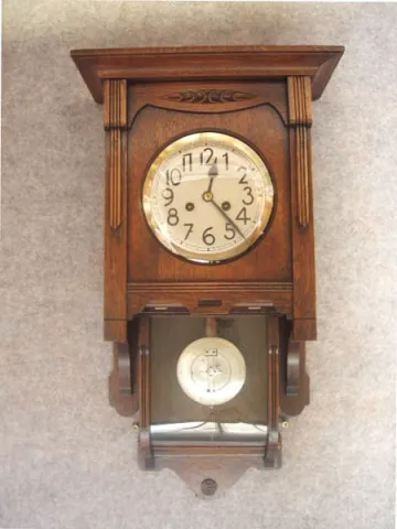 German "Berliner" Style Wall Clock With An Enclosed Bottom Case Of Oak Solids And Veneers By F. Mauthe. Circa 1900-1910.