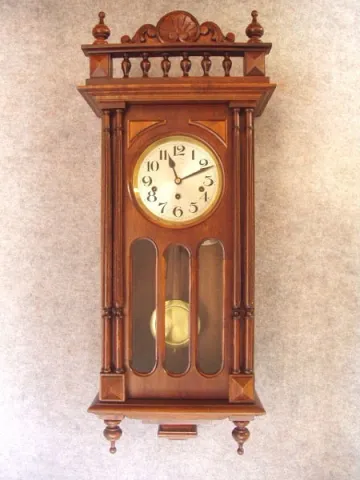 Walnut Case With Widows Walk Top And Carved Top Piece. Double Side Columns, 3 Panel Plain Glass In The Lower Door. Silver Arabic Dial, Brass Pendulum ...