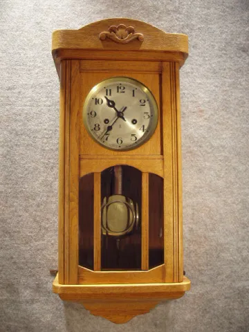 The Case Is Oak Veneered. The Lower Part Of The Door Has 3 Panels Of Wood Set Beveled Glass. The Dial Is Silvered With Arabic Numerals. The Brass Pend...
