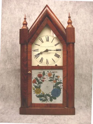 Sharp Gothic (Steeple) Shelf Clock By Chauncey Goodrich In A Rosewood And Mahogany Veneered Case With The Original Finials, Circa 1855-60.