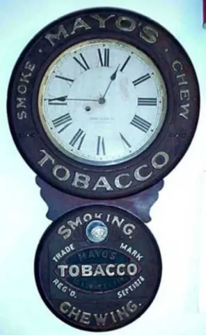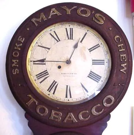 Baird clock, Mayo's Tobacco, circa 1893, with signed movement and dial.