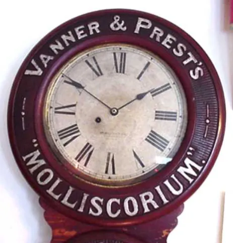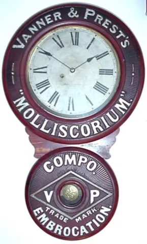 Baird clock, Vanner and Prests Molliscorium (horse liniment), circa 1895, signed works E. Baird Clock Co., Plattsburgh NY.