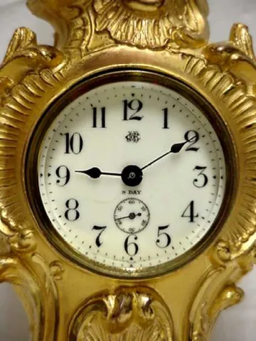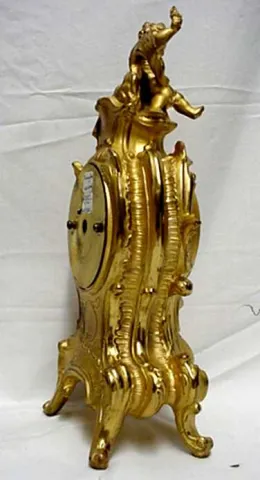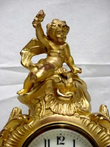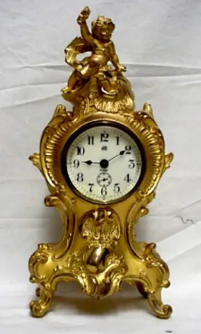 Antique clock, 11 1/2" Jennings Bros. of Bridgeport Ct, gold gilt clock with cherub. Size is 11 1/2" by 5" by 3". The case is breathtaking. The origin...