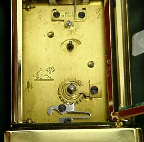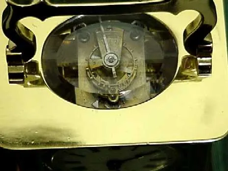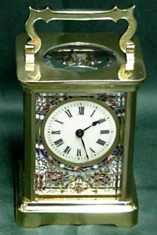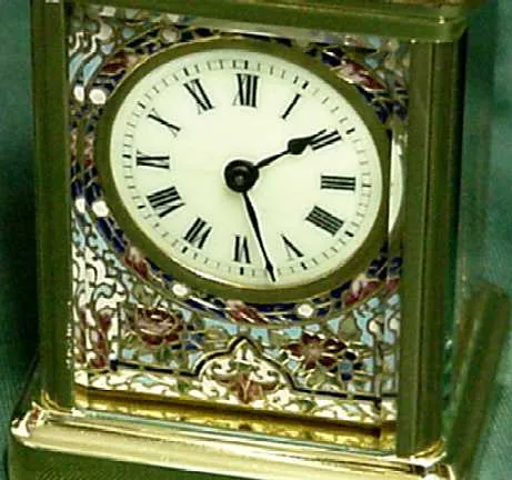 French antique champleve carriage clock. This little gem has a 1 3/4" porcelain dial with a 3 1/4" by 2 1/4" champleve dial mask. The colors are light...