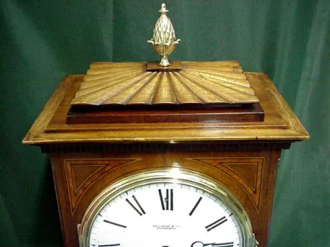This magnificent inlaid clock is 17" high, 11 1/4" wide, and 7 7/8" deep, with a perfect 7 1/2" convex porcelain dial. The clock is 100% original and...