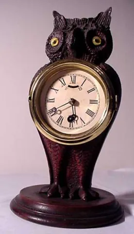 American antique folk art clock, hand carved owl, 30 hour, original finish. Dated 1850, this well-detailed owl clock is hand carved. The wood appears...
