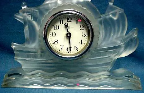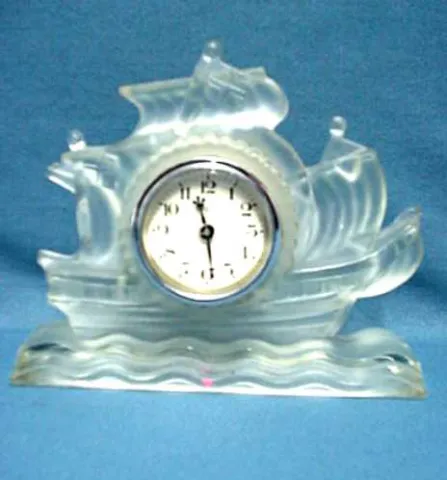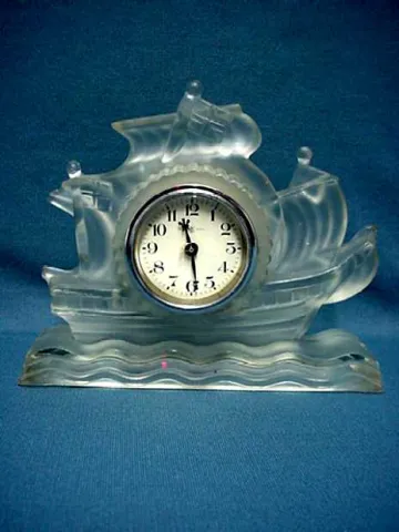 Clock, sailing ship, frosted glass. The clock has the look of Lalique. In 30 years in business this is the first I have seen like this. Circa 1930, t...