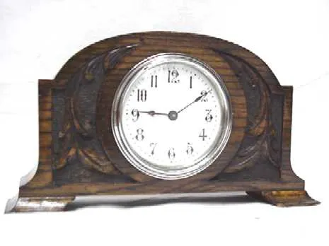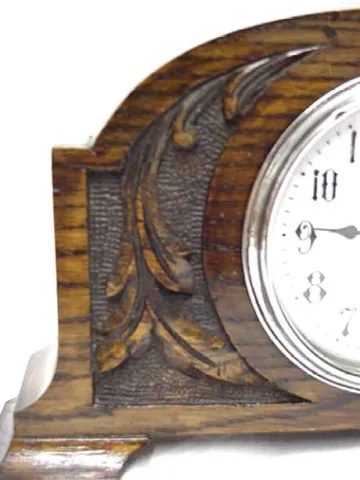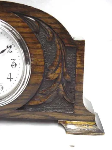 Solid oak, hand carved antique desk clock. Size is 10 1/4" by 6" by 2 1/2". Solid oak case has a wonderful original finish, the oak grain is exception...