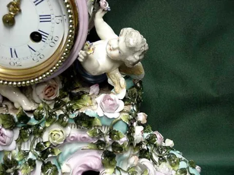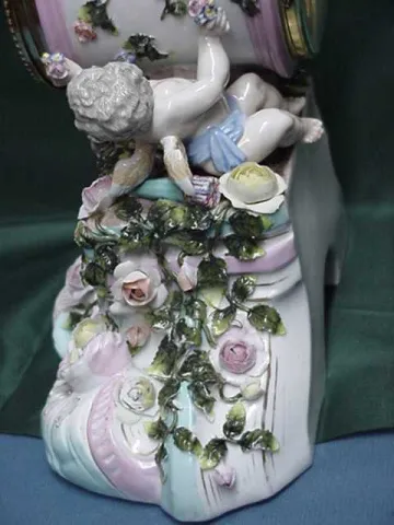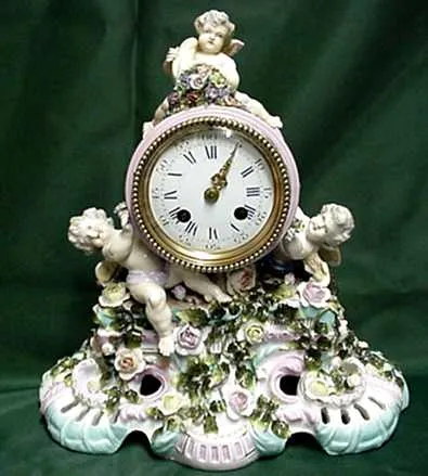 Meissen porcelain clock with three cherubs, 8 day. Circa 1840-1859, very desirable Meissen Clock. Height is 24", width at the base 24", depth at the ...
