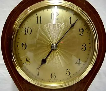 Antique clock, French desk or mantel, balloon style with inlay design. CIRCA: 1890 SIZE: 9" x 5 1/2" x 3 1/4" with a 3 1/4" dial MAKER: Cauaillet, Sa...