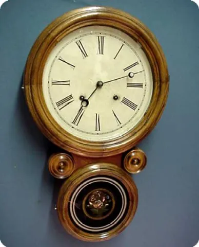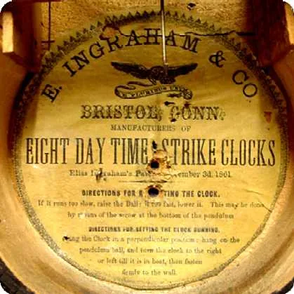 Wall clock, E. Ingraham, Ionic, pristine Ingraham Figure- 8, circa 1870 - 1880. Size is 22" length, 4" deep, 13 1/2" diameter at the top and 8" diamet...
