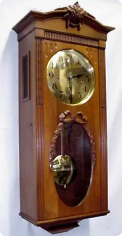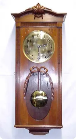 Antique German Hand carved walnut wall clock, made for the French market, with Westminster chimes. CIRCA: 1900 SIZE: 34" by 14" by 6 1/4" with an 8" ...
