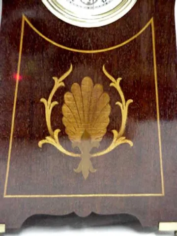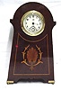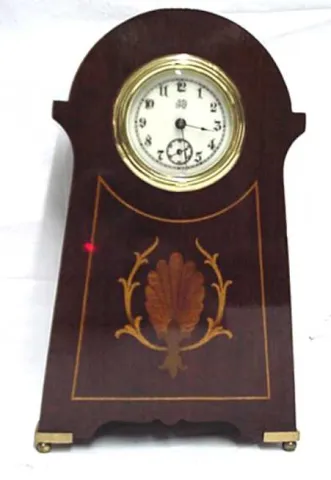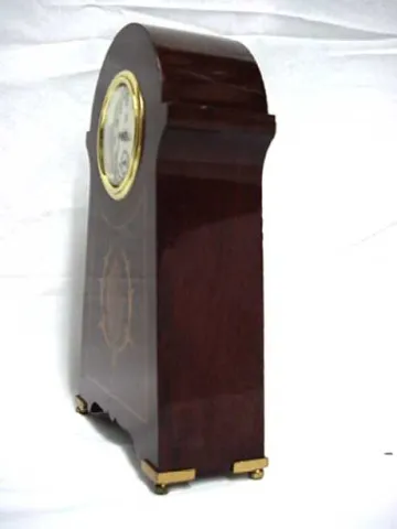 Edwardian desk clock with inlay. Size: 8 1/2" by 5" by 2" The case is made of solid mahogany and retains its original finish. The finish and inlay are...