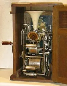 with double spring motor for sprocket drive - hill and dale reproducer - short trumpet by Hiller. As usual the recorded film strip is missing. 16.5" h...