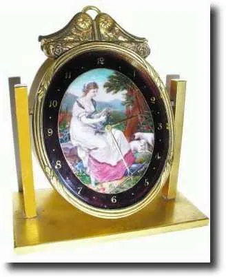 C.1925, Swiss, Gubelin, Lucerne, small 8-day jeweled lever desk clock with a wonderful enamel dial of a country maiden tending 2 sheep in the meadow while making a floral wreath with twine and ribbon (superb detail). Items like this are more of a work of art than a precision timepiece and this is sure to be of interest to the ladies. Height 5" $1000-1250