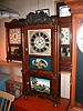 Triple decker mantle clock with reverse-painted tablets and eight-day strap movement.