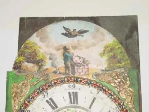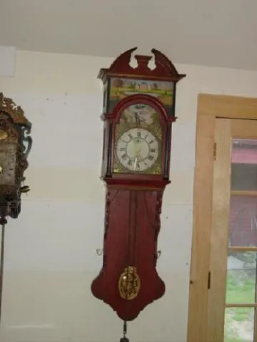 This magnificent double-hood tail clock (in Dutch: STAARTKLOK), was made in Holland around 1850. On the painted iron dial, there is an animated scene ...