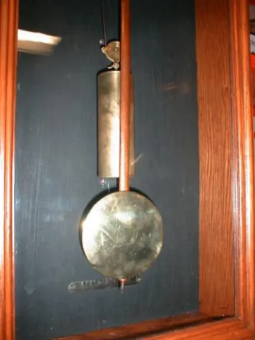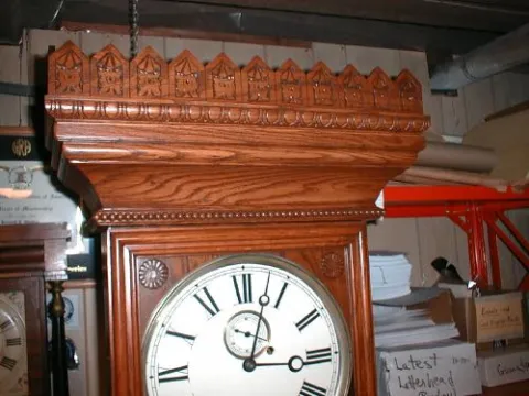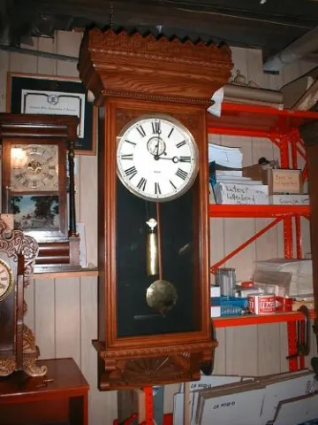 Eight-day weight-powered wall regulator with solid Oak case.