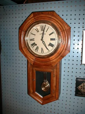 Walnut finished pine case eight-day "Schoolhouse" clock with strike on the hours.