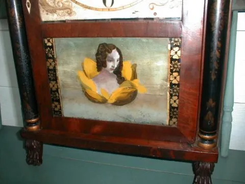 Because this clock was made by a rarely found maker, it is surely a collectors DREAM! The original lower door glass retains its "Lady In The Flower" d...
