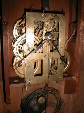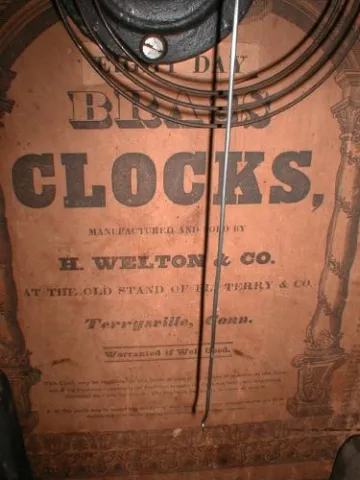 8-day time and strike OG clock with very early brass movement by Hiram Welton, Plymouth, Connecticut.