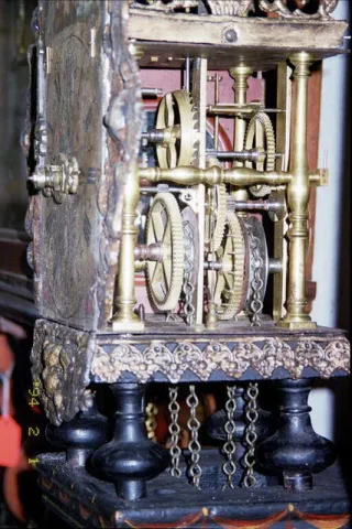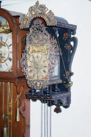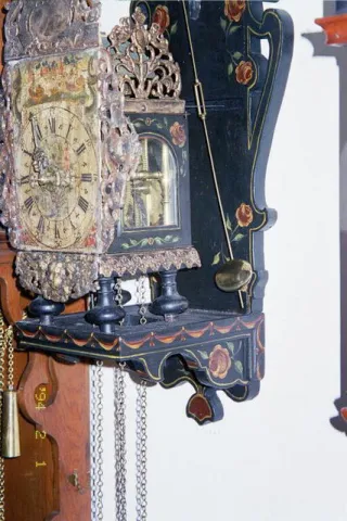 This early Dutch Stoel clock (English translation-"Stool") was so named because the bracket on which it stands with little knobby feet, looks like a s...