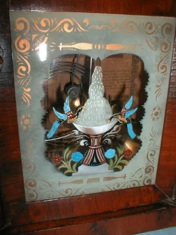 8-Day Steeple clock with reverse painting on lower door glass.