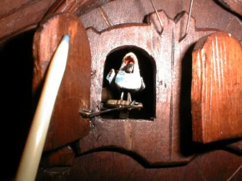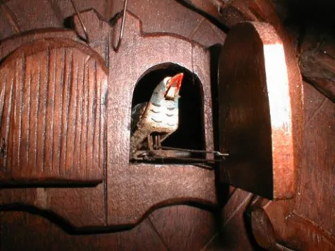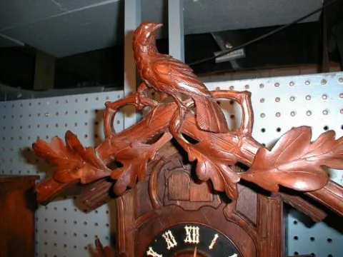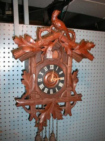Another in our growing collection of wonderful Black Forest clocks. This cuckoo/quail wall clock features eight deeply carved Oak leaves and a large b...